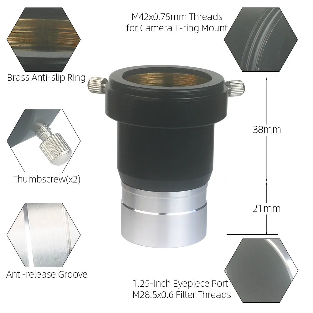 - Threaded to accept standard 1.25" astronomy filters, allowing customization for different observations.