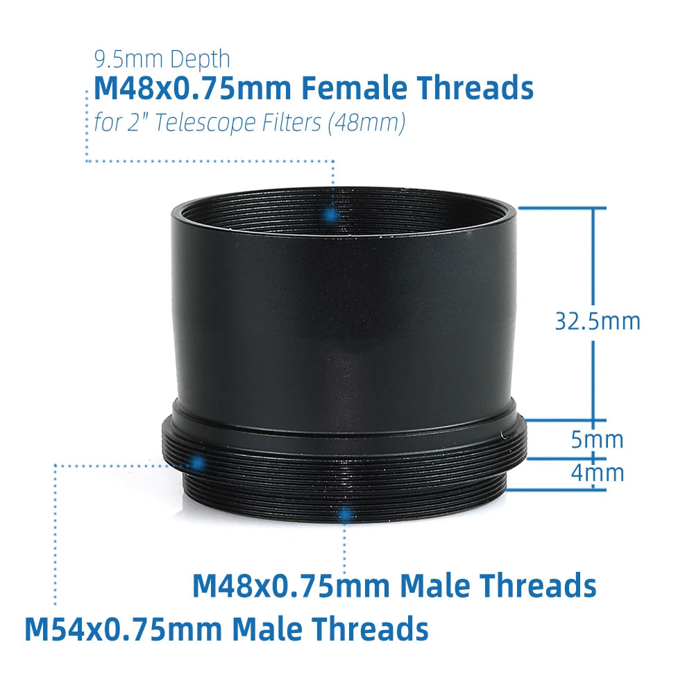 - Threaded for standard 2-inch eyepiece filters with M48*0.75mm threads, the adapter allows seamless integration with astrophotography filters. The fully baffled design reduces reflections, ensuring optimal image quality.