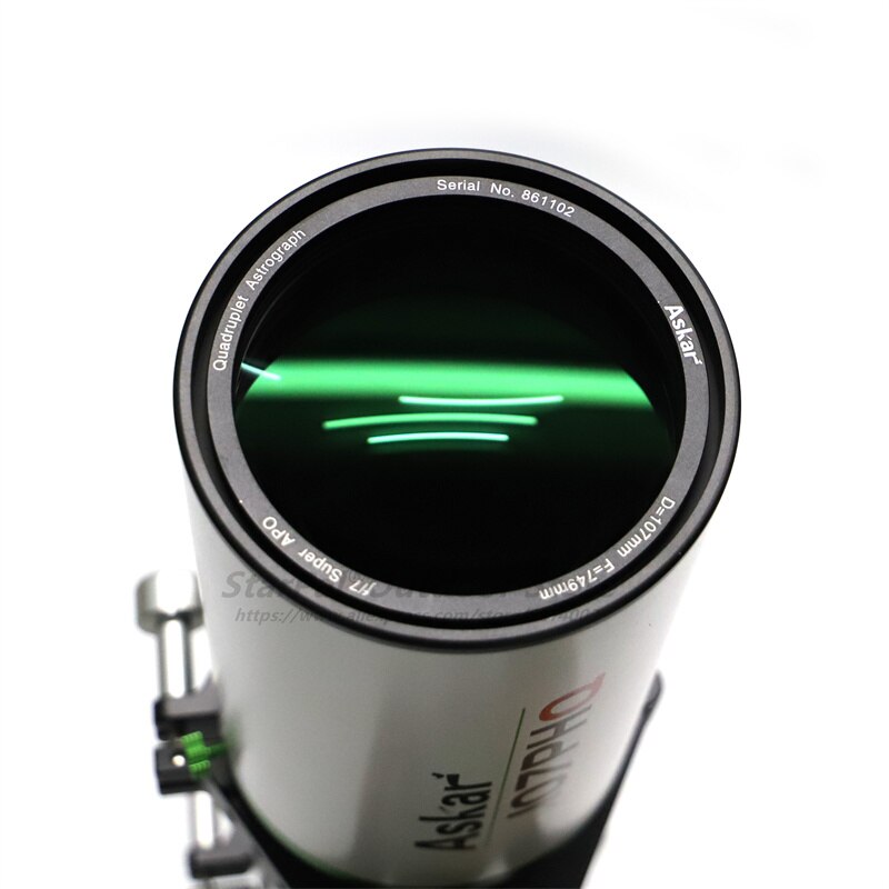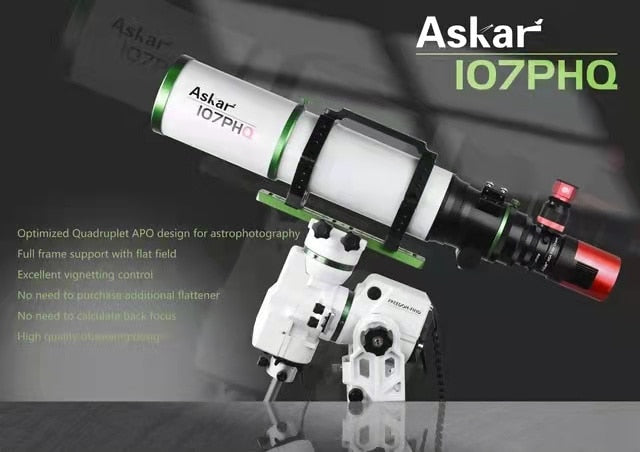 The Askar 107PHQ is equipped with a super APO lens that reduces chromatic aberration, resulting in images with high contrast and accurate color reproduction. The flat field design ensures that the entire field of view is in focus, making it ideal for astrophotography applications.