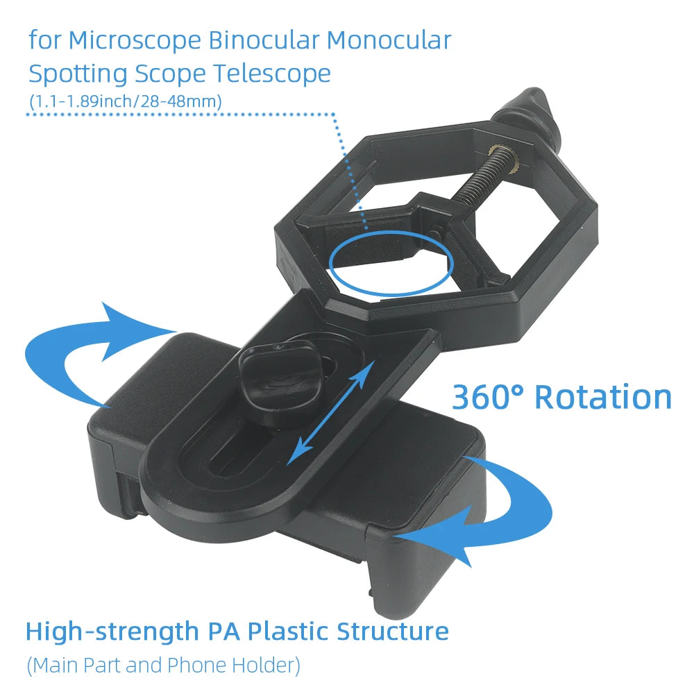 Unlock the potential of your monocular, microscope, telescope, binoculars, or spotting scope with the Smartphone Adapter. Crafted from durable PA plastic, this adapter offers a lightweight yet sturdy solution to connect your phone to various optical devices.