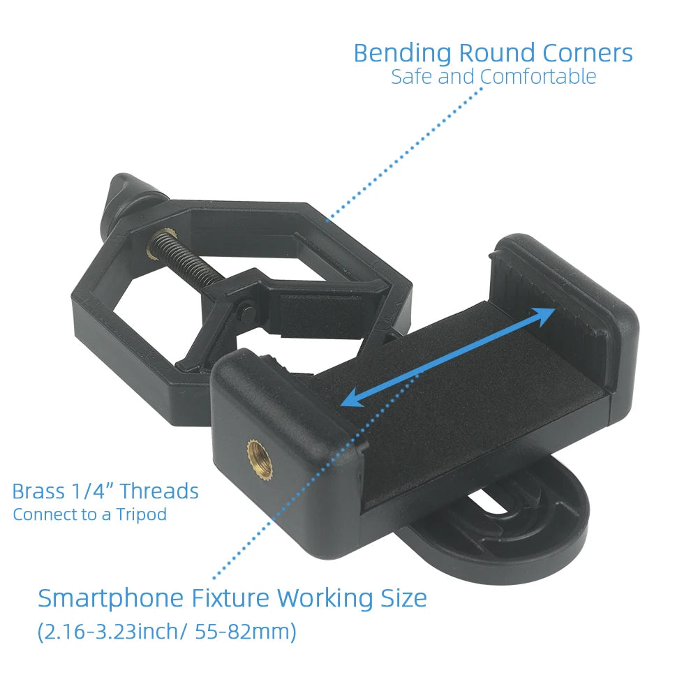 Equipped with a spring-loaded phone clamp, the adapter ensures a secure and stable grip. Simply pull it open, place your phone into the clamp, and let it securely hold your device in place. Effortless and convenient, this adapter allows you to focus on the wonders before you.