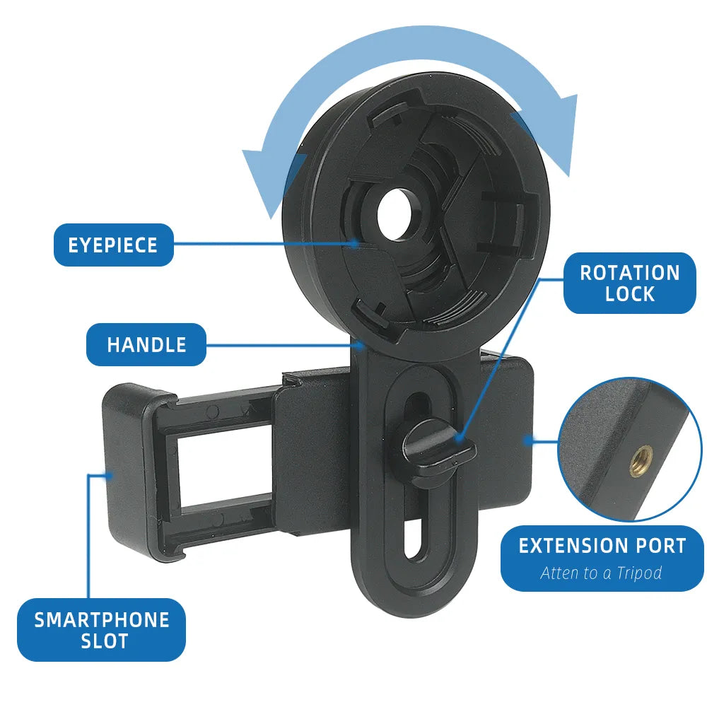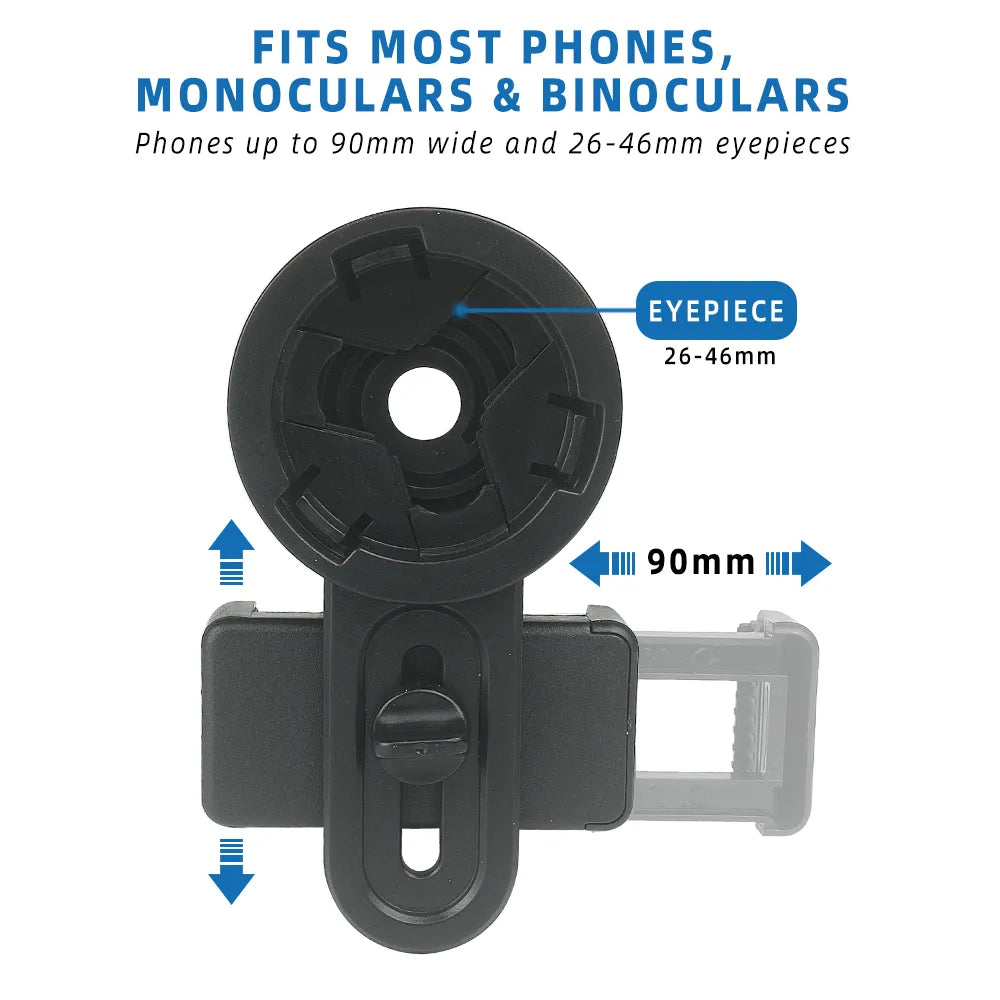 The spring-loaded smart phone adapter for telescope, paired with a sturdy eyepiece, ensures your phone stays secure while setting up and capturing the perfect shot. Its small, compact, and lightweight design transforms your monocular into a powerful scope for close-up photos on the go. Fit both monoculars and binoculars with a 26-46mm eyepiece for maximum flexibility.