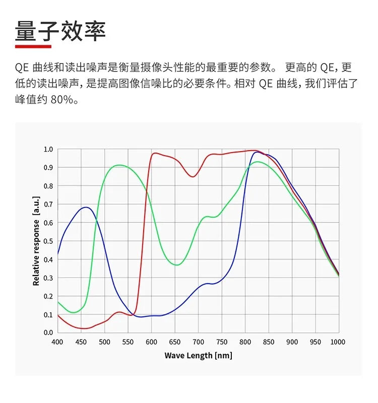 - Quantum Efficiency (QE): Achieve remarkable image signal-to-noise ratios with the ASI715MC's estimated peak QE of 80%. The QE curve and low readout noise ensure superior performance, capturing more light for vibrant and detailed images.
